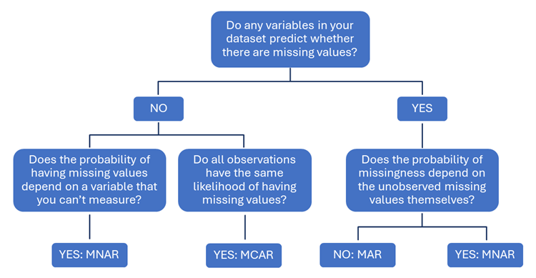 The flowchart below shows how this information can help you identify the type of missingness in your data.