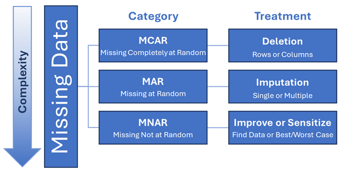 Increasing the quality of your data is a long-term process, however, and most analysis can’t be put on hold until the data improves. In the short term, you’ll probably have to work with the data as it is, including any missing information, when you analyze it. Fortunately, there are many methods for accounting for missingness in data analysis, ranging from simple to very complex. Data that is MCAR can generally be resolved using fairly simple techniques, while data that is MNAR requires more complex methods.