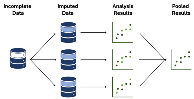 Multiple imputation through chain equations (MICE) is a commonly used imputation technique where instead of filling in a single value, the distribution of the observed (i.e., actual) data is used to estimate multiple values, in multiple datasets, that reflect the uncertainty about what the missing value is. These estimated values are then used in the analysis of interest, such as a logistic regression, and the parameter estimates (e.g., coefficients and standard errors) and results from each analyzed dataset are then combined. By creating multiple estimated values and analyses, this method can offset the artificially reduced variation in data that can happen with simple imputation.