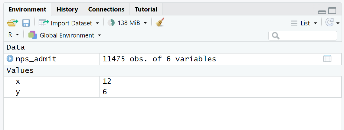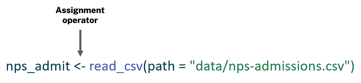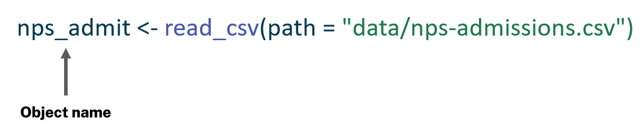 The first part of the code, nps_admit is the name of the new object you are creating. Objects in R can be many different things, such as data frames, vectors, or lists. But the basic idea is that an object is a named “thing” that is stored in R memory that you can refer to by its name.