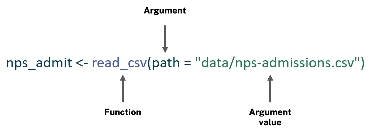 Here, the function you are calling is read_csv() and the argument value is the path to the CSV file, "data/nps-admissions.csv".